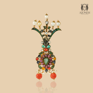 Presenting our exquisite Ashoka Kalgi – a symbol of nobility and honor, crafted with intricate detail and adorned with rich gemstones. This elegant piece is designed to add a touch of royal splendor to any ceremonial attire, making it the perfect accessory for a modern-day Maharaja. Featuring stunning craftsmanship and adorned with exquisite gemstones, this intricately designed Ashoka Kalgi embodies nobility and honor. With its regal aura, this elegant piece complements any ceremonial attire, adding a touch of royal splendor fit for a modern-day Maharaja.
