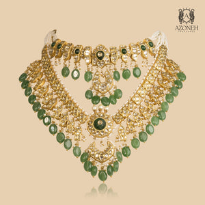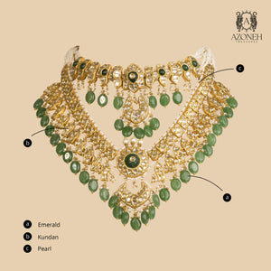 A full bridal fantasy — crafted like a royal heirloom meant to be passed down. The layered silhouette sits grandly, covering the neckline in intricate kundan artistry that glows like candlelight on gold. Emerald drops add depth and drama, creating that regal green contrast every bride dreams of. Pearls bring softness and tradition, giving the piece a sacred, ceremonial elegance. This is not a “necklace” — it’s a complete look, a statement of legacy, and an instant transformation. Made for pheras, receptions, and entrances where you want silence in the room before applause. Gulshan-e-Shahi Set