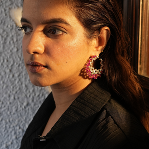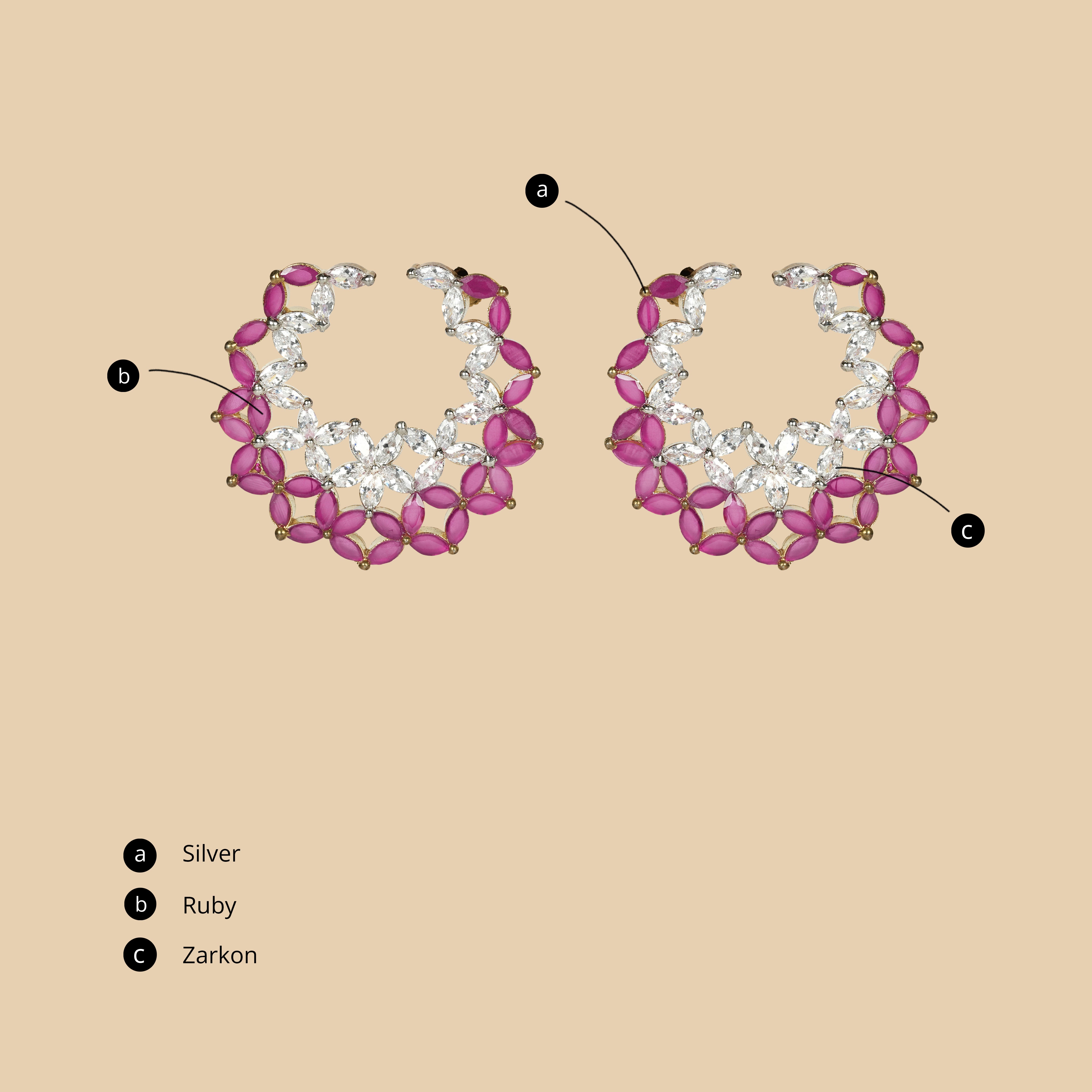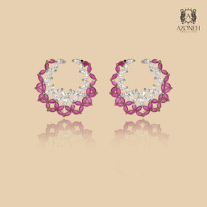 Izna Earrings, where modern design meets timeless allure. These exquisite ruby earrings, shaped like hoops, are adorned with brilliant zircon stones that catch the light with every movement. The deep red of the rubies evokes passion and sophistication, making them the perfect accessory for any occasion. Elevate your style and make a statement with the Izna Earrings, where every glance will leave you and others enchanted. Add a touch of elegance to your outfit with the dazzling Izna Earrings. The delicate hoops, featuring stunning zircon stones, add a subtle sparkle to your look. The vibrant rubies symbolize passion and refinement, making these earrings a must-have for any occasion. Transform your appearance and captivate everyone's attention with the timeless allure of the Izna Earrings.