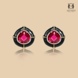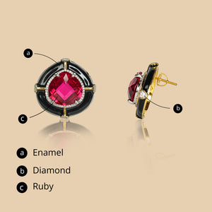 A striking combination of diamonds and ruby, these ear tops showcase our love for classics! It gets the name from the 'moon', Kanaloa represents dark and darkness. Beautifully handcrafted they hold a stunning ruby in the centre lined with black enamel and brilliant cut diamonds. Experience the timeless elegance and luxury of Kanaloa Ear Studs. These sophisticated ear tops feature a stunning ruby at its center, delicately encased by a sleek black enamel lining and exquisite diamonds. Expertly handcrafted, these earrings are a nod to classic design and exude a sense of sophistication and grace.