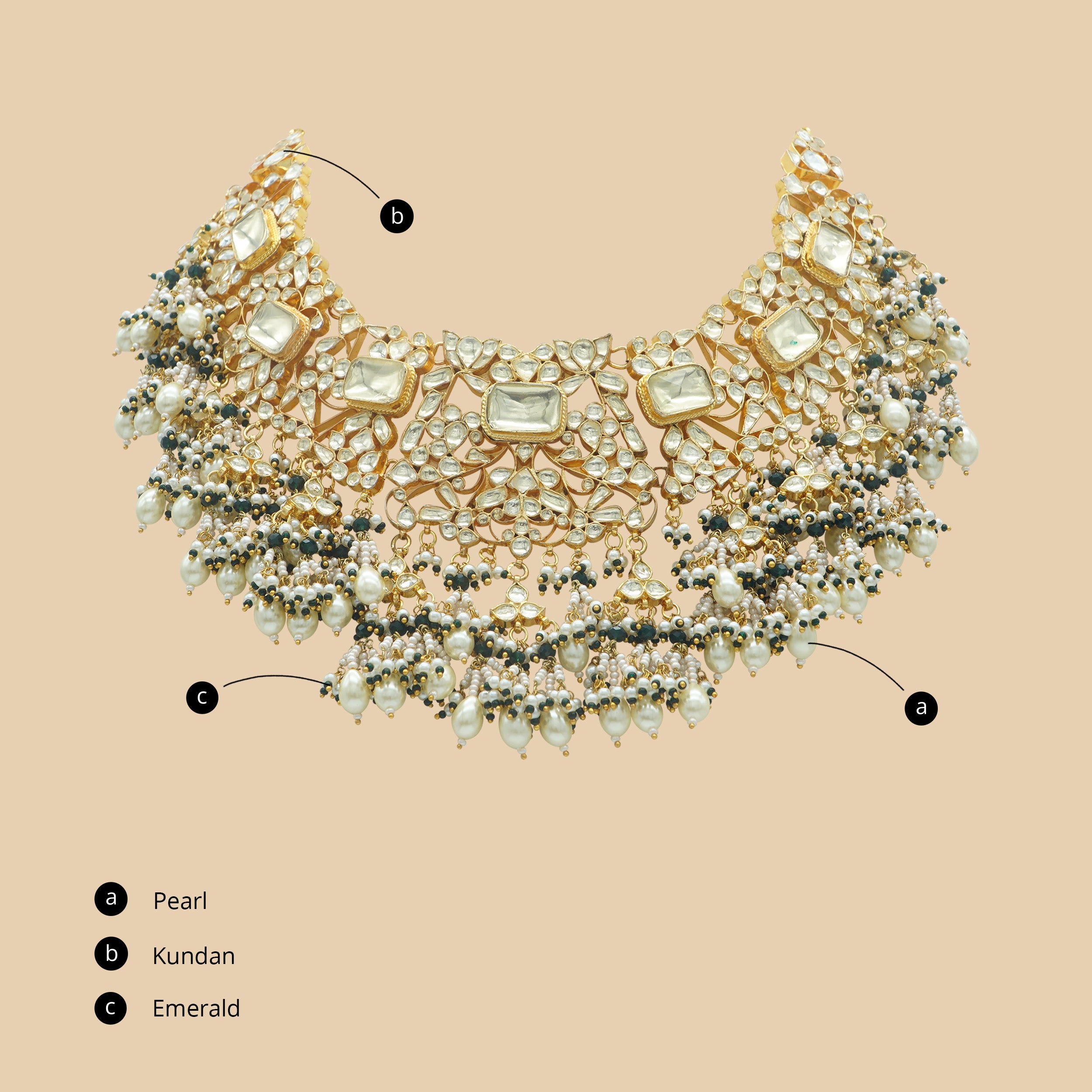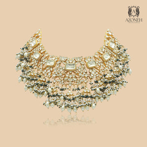 Elegant and poised, the Naazgul Haar drapes like poetry across the collarbone. Designed with refined intricacy, it carries a regal air that celebrates both femininity and tradition. Wear it as a treasured heirloom piece or pair it with contemporary ensembles for a striking contrast.