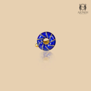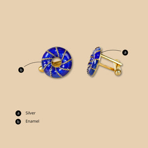 A pair of silver unisex cufflinks, donut shaped, each made with beautiful blue pierced with gold and a border set withmore gold. Beautiful craftsmanship meets unique design with these stunning cufflinks. The silver and gold accents create a sophisticated look that will elevate any outfit. These cufflinks are the perfect choice for the fashion-forward individual looking to add a touch of luxury to their wardrobe.