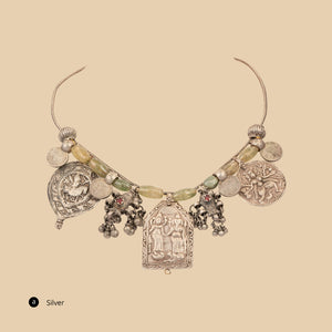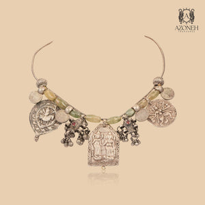 Nomad Heritage Necklace is inspired by wanderer traditions and tribal artistry. Silver coins, textured charms, and oxidized motifs come together in a bold, hasli silhouette. Each medallion and detailed plate tells a visual story of history across cultures, making this necklace a captivating statement for both ethnic and contemporary looks. Comfortable and substantial, it instantly elevates everyday outfits while remaining perfect for festive occasions. Rich with character, the necklace delivers both style and soul—ideal for those who celebrate artisanal craft and global fashion influences in one wearable work of art.