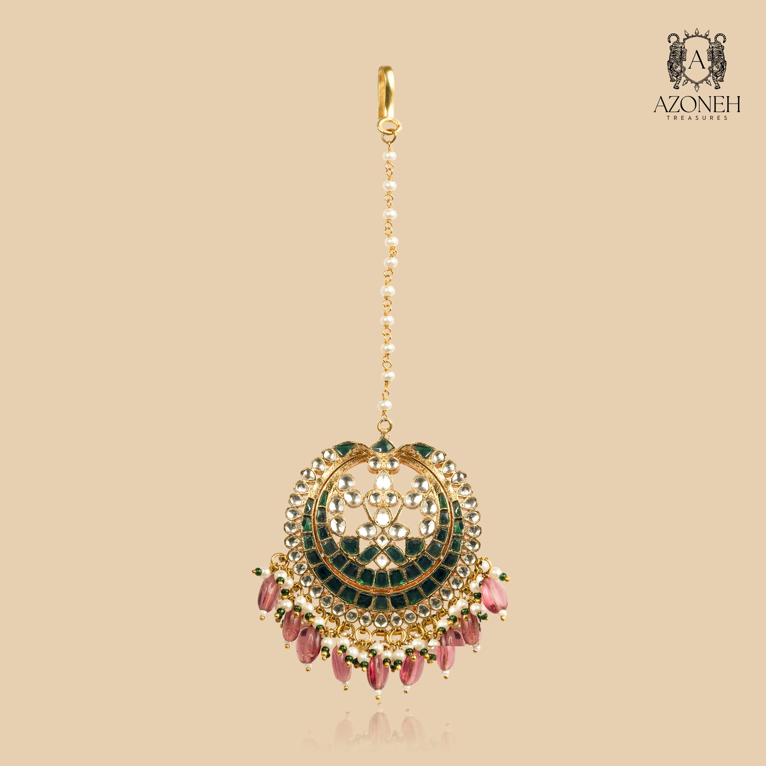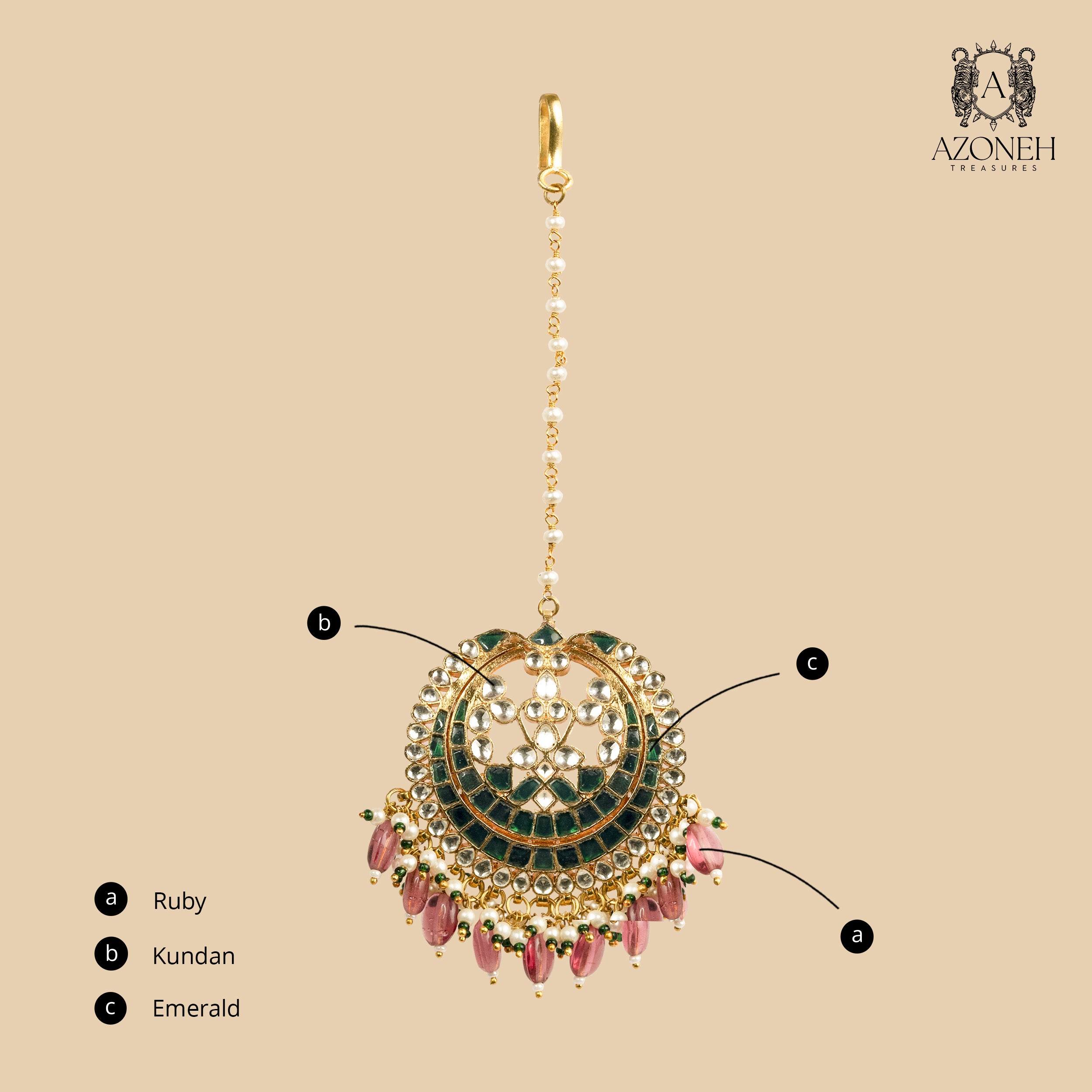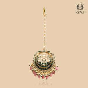 This tikka feels like a blessing placed gently on the forehead — sacred, royal, and intensely beautiful. The round motif is crafted with heritage kundan detailing that glows like antique candlelight, while ruby accents add bridal warmth and emotional richness. Emerald tones bring depth like palace gardens after rain, creating a regal contrast that instantly elevates the face. Pearl drops add softness and movement, like tiny prayers swaying with every step. This is the kind of tikka that completes your entire bridal look without needing anything extra — powerful, ceremonial, unforgettable. Noor-e-Sabz Tikka