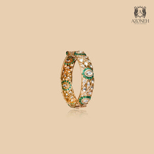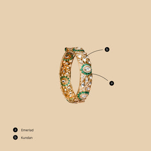 The Regal Harmony Bracelet intertwines emeralds with kundan detailing, blending vibrant green hues with metallic shimmer. Its seamless design exhibits balance and refined craftsmanship, reflecting tradition in a wearable contemporary form. Perfect for festive occasions or elevating everyday wear, it lends the wrist a sense of timeless elegance and joyful prosperity. The combination of color and metallic texture offers a luxurious embrace, making this bracelet a symbol of growth, beauty, and celebration.
