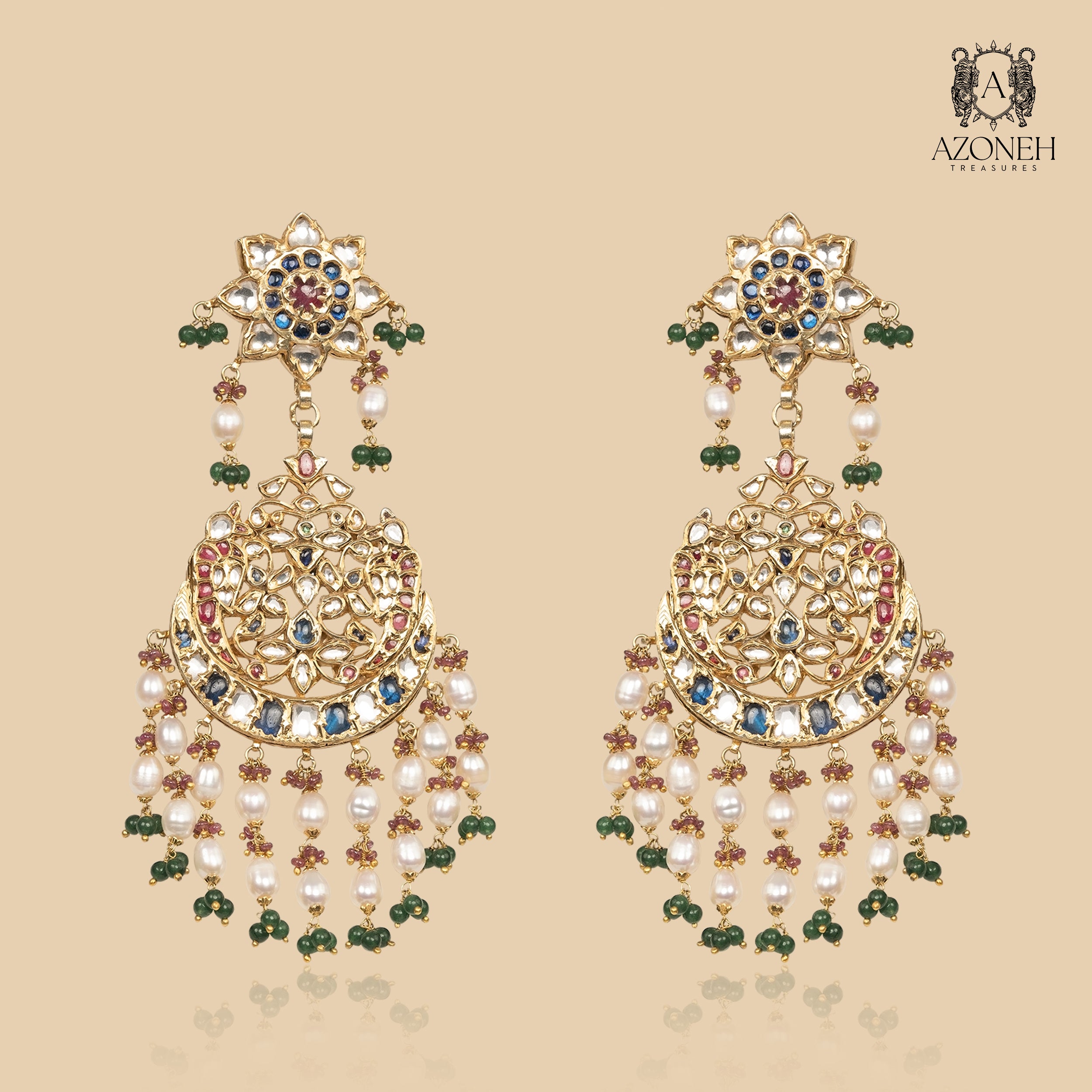 This choker feels like bridal royalty carved into jewellery — powerful, ceremonial, and unforgettable. Kundan craftsmanship gives it that heritage glow, while ruby warmth adds romance like wedding fire rituals and sindoor skies. Emerald accents bring depth and regal contrast, and pearls soften everything with blessings that sway gently as you move. The touch of tanzanite adds a rare dreamy twist — like twilight woven into tradition. With its layered detailing and grand silhouette, this isn’t a “piece” — it’s the entire statement. Made for brides who want to look like legacy, not just luxury. Shehzaadi Zameen Choker