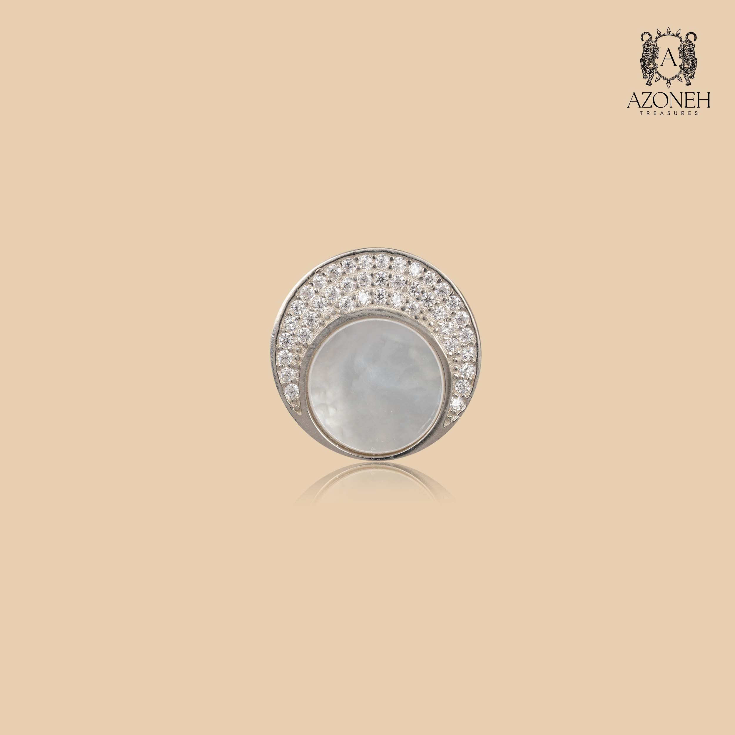 The Celestial Crest button captures purity and poise in swirling pearl-white.