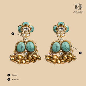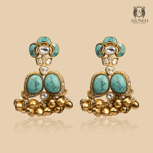 A little playful, a little royal — these earrings hold a sky-coloured charm that feels fresh, flirty, and timeless. The firoza tones bring a breezy softness, like summer laughter and open terraces. Kundan detailing adds structure, giving the pair that unmistakable heritage elegance, while the golden ghungroo-style drops create a gentle rhythm with every movement. These are the earrings you wear when you want compliments without trying — festive enough for functions, light enough for day looks, and bold enough to feel like your signature. Aasman Jhumki Drops