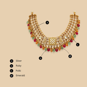 Designed as a flexible row of gem-encrusted plaques, this handcrafted necklace reminds us of a simple 1990s wedding. Arranged in a play of a versatile color palette of rubies, emeralds and citrine, the necklace is bordered with ghungroo jaal on the top. Elevate your style with this striking Barkha Necklace, handcrafted with gem-encrusted plaques that offer a touch of timeless elegance. Its vibrant color palette, featuring rubies, emeralds, and citrine, will make a versatile addition to any wardrobe. The ghungroo jaal border adds a beautiful finishing touch to this exquisite necklace.
