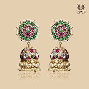 This pair is full bridal energy — the kind that feels like heirloom joy passed through generations. The top blooms in ruby tones, rich and romantic, while emerald accents add royal contrast like green velvet in palace halls. Kundan detailing glows warmly, giving the whole piece that antique grandeur, and pearl drops complete it with softness and blessings. The jhumka silhouette makes every movement feel musical — as if the earrings are dancing along with you. Perfect for weddings, sangeets, and moments where you want to look like legacy wrapped in glamour. Begum-e-Rang Jhumkas