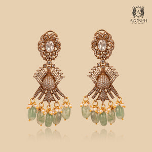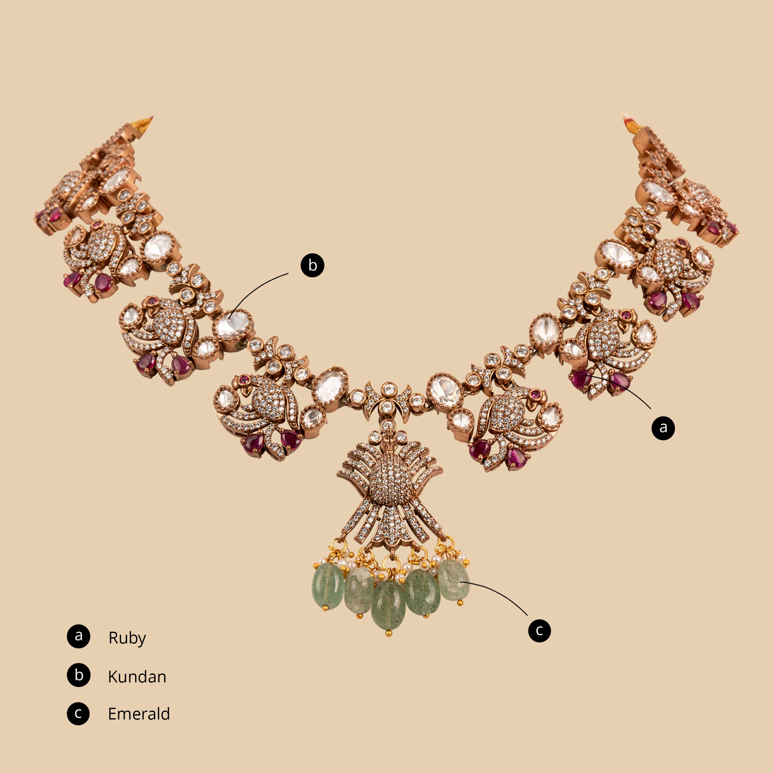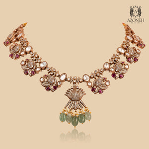 The Chaandbali Gardenia Necklace is an ode to ornate beauty, featuring crescent-shaped flower clusters set among delicate vines. A gentle ombré of champagne, blush, and green drops dangles playfully, complementing the antique finish. Matching chandelier earrings echo the necklace’s lush symmetry and eclectic glamour. This set celebrates the romantic spirit of traditional Indian festivity, making it ideal for pre-wedding occasions, haldi, mehendi, or heritage-inspired ensembles. Each element is thoughtfully crafted, ensuring the wearer feels draped in garden-inspired elegance that blooms with every joyful movement.