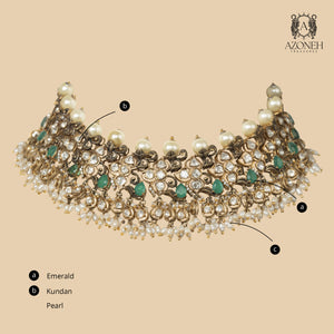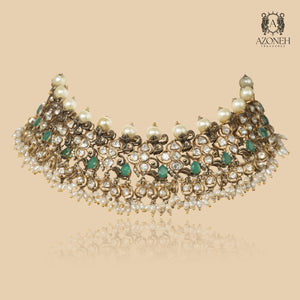 Elaria Devyani rests along the collarbone like a crown laid gently upon the heart. Its layered silhouette carries the grace of temple corridors and the romance of candlelit durbars. The rhythm of its detailing creates soft movement, catching attention without demanding it. Designed for bridal moments and heirloom celebrations, it transforms posture instantly. Elaria Devyani is not just worn — it frames the wearer in quiet royalty and timeless devotion.