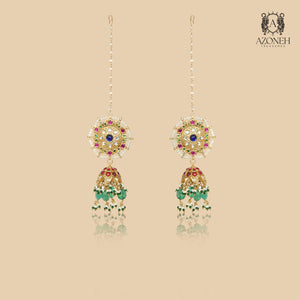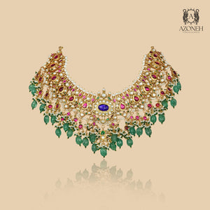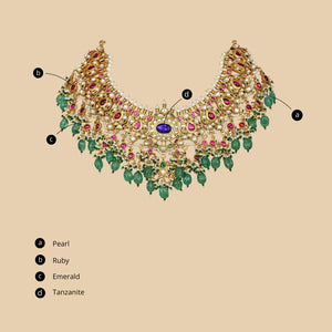 Expertly crafted for the discerning modern bride, Faiz Necklace is the embodiment of refined luxury. A stunning combination of deep rubies, vivid tanzanite, lush emeralds, and luminous pearls, this exquisite choker is a true masterpiece of intricate artistry. Its regal arrangement ensures it catches the eye with each turn, while its understated elegance elevates every cherished moment.
