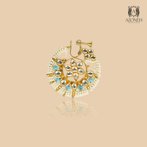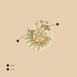 Firdaus Pearl Nath offers celestial charm with a burst of golden radiance and a constellation of pearls fanning outward. The intricate pattern sits lightly on the nose, adding drama and definition. Elegant yet versatile, this nath suits both classic bridal looks and inventive fusion styling, bringing a sense of occasion and divine ease to every event.