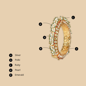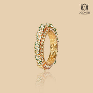 The design of this pearl and gold bangle is inspired by the Gajredar bangles and Pacheli bangles—bangle types popular in Rajasthan and Northern India. Discover the rich traditions of Northern India with this elegant pearl and gold bangle. The design is inspired by the Gajredar and Pacheli bangles, bringing you a timeless and sophisticated style.