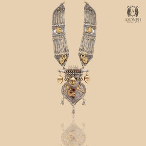 The Gauhar necklace is a haar-style necklace handcrafted in silver. Royalty-inspired and given the Azoneh spin, the necklace is designed keeping in mind a true-blue modern Indian wedding. The necklace comes with Motifs that have an old world charm to it and has animal motifs going up the pendant. The necklace is finished with dangling bunches of silver Ghunghroos. Expertly crafted with intricate silver details, the Gauhar necklace boasts a regal design that embodies the timeless elegance of Indian weddings. The pendant features stunning animal motifs and old-world charm, accented by delicate Ghunghroos for added flair. Perfect for adding a touch of sophistication to any outfit, this necklace is a must-have for any modern bride.