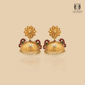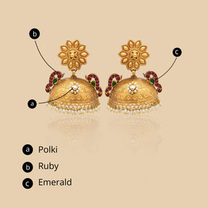 Handcrafted entirely in gold, the Gul Indian gold earrings are a true reflection of India's cultural heritage. An indispensable part of the culture, motifs shaped as flowers adorn the top of these silver earrings. The jhumkas add a sophisticated element of quirk. Style them with a traditional for a classic wedding look! Expert opinion: "The Gul Earrings are a stunning example of India's rich cultural heritage. The intricate flower motifs, crafted from gold and silver, are a must-have for any traditional event. These jhumkas add a touch of sophistication and uniqueness to any outfit, making them a versatile accessory for weddings and other special occasions. Don't miss out on adding a piece of India's cultural history to your wardrobe."