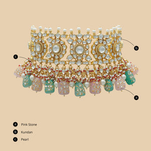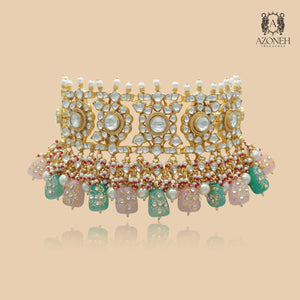 The Gulrukh Necklace embodies traditional grace reimagined for the modern bride. Its curved silhouette frames the neckline with quiet strength, while delicate detailing evokes centuries of artistry. Worn with silks or muted tones, it becomes a statement of heritage and timeless beauty.