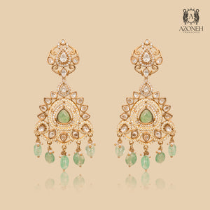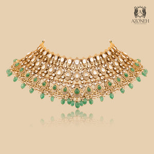 A full celebration in one necklace — wide, radiant, and designed to make the entire look feel complete. The kundan base glows like heritage gold under warm lights, while zircon shimmer adds a modern brightness that photographs like a dream. Emerald detailing brings depth and richness, like palace gardens woven into jewellery. The finishing touches fall delicately, creating movement that feels like blessings with every breath. This is not minimal — this is bridal grandeur, crafted for sangeet nights, wedding pheras, and receptions where you want to look timeless and unforgettable. One piece, and the whole room knows you are the moment. Gulshan Noor Haar