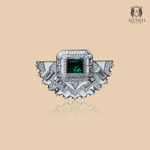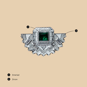 in a bold winged form. Deep emeralds and sparkling zircon line the spread, echoing
