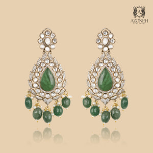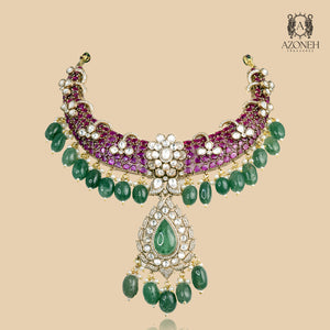 This necklace feels like a royal celebration held under palace lights. The ruby tones glow like festive warmth, while emerald drops bring that regal garden depth — fresh, powerful, and impossibly elegant. Zircon sparkle adds a crisp brilliance that makes the entire set photograph like a dream, catching light with every breath. The curved silhouette frames the neck beautifully, creating an instant “bridal face card” moment. It’s not just jewellery — it’s an entrance. Made for sangeet nights, wedding dinners, and grand occasions where your outfit needs one final touch of royalty. Wear it and let the room remember you. Jashn-e-Sabz Set