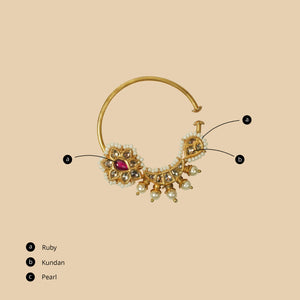 The Jashn Ruby Nath weaves kundan, ruby, and pearl into a celebratory arc, anchored by a delicate linked chain. Rich color meets refined silhouette, echoing the festivities of Indian weddings and cultural gatherings. On every bride, it adds vibrancy, tradition, and joyful resonance, marking milestones with effortless sophistication.