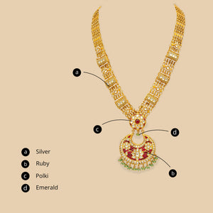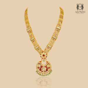 A long gold and pearl necklace for women (haar) with a pendant representing a crescent. This statement piece has a beautifully detailed pendant with a chaand motif as the centre. Made with high-quality materials, this statement piece is perfect for any occasion. The intricate crescent pendant features a chaand motif, adding a touch of elegance and sophistication to the necklace. Whether it's worn with a formal outfit or dressed down for a more casual look, this versatile piece is a must-have for every woman's jewelry collection.