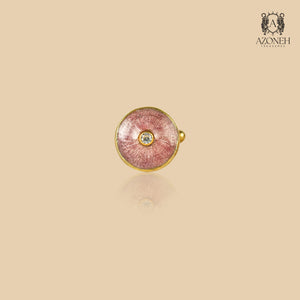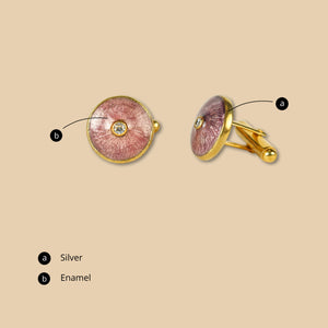 A pair of round, silver unisex cufflinks featuring stunning rose gold accents and a gold border. Each cufflink is elegantly finished with a diamond at the center, adding a touch of sophistication and luxury. Each pair boasts a unique design, crafted with the highest quality materials. The delicate rose gold accents and striking diamond at the center make these cufflinks an elegant and luxurious addition to any collection. Elevate your style with Lilian cufflinks.