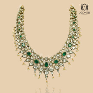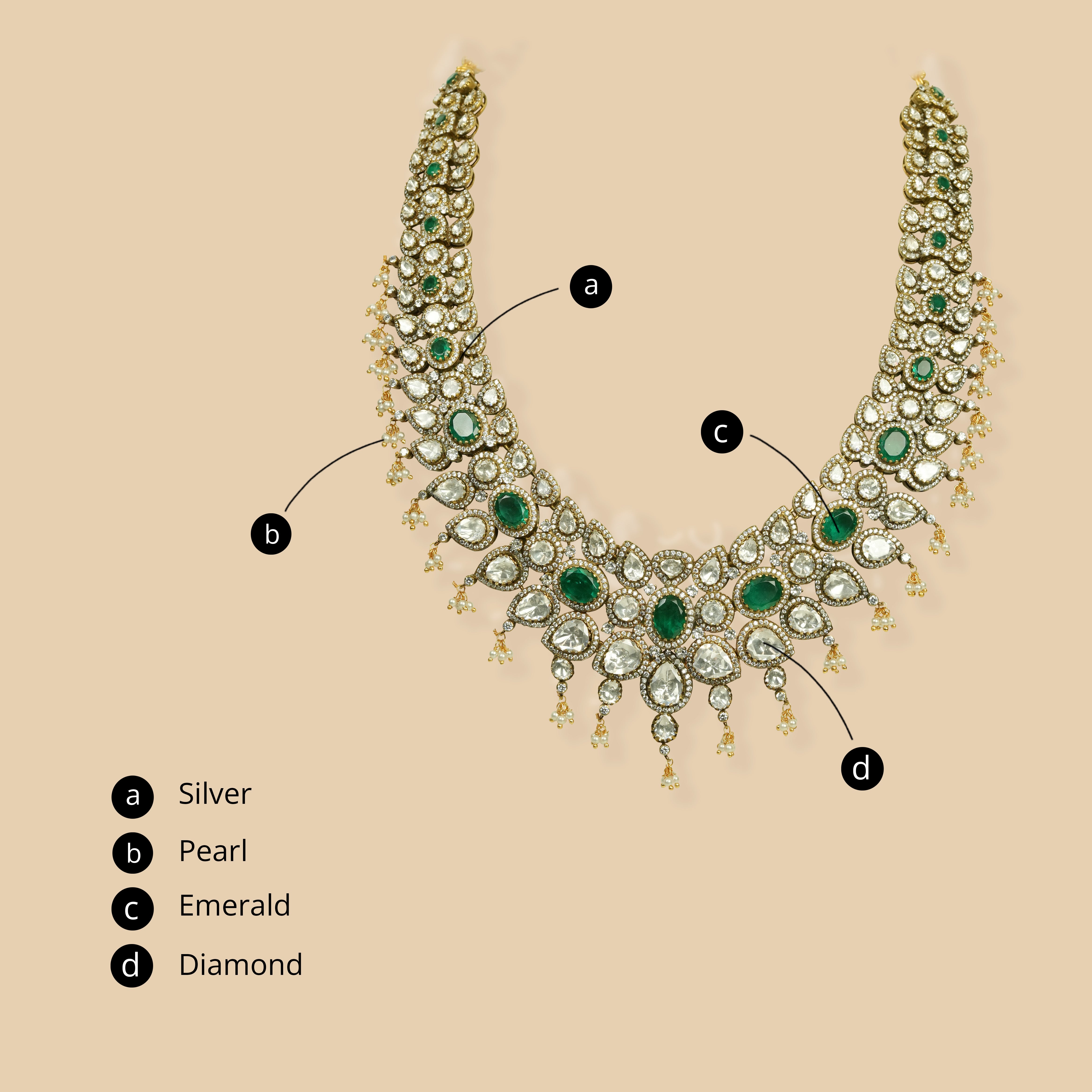 A contemporary diamond and pearl necklace infused with an Indian touch is all you need to outshine a show. The iconic Indian crescent motif of the Malika Necklace has skillfully been handcrafted with gold and studded uncut diamonds. The centerpiece is linked to strings of intermittently placed pearls pierced with diamonds and hanging gemstone elements and gold balls. The exquisite Malaika Necklace features a stunning blend of traditional Indian design and modern luxury. Made with genuine gold and uncut diamonds, this necklace is a true masterpiece. The intricate crescent motif, adorned with diamonds, is complemented by strings of pearls and gemstone elements, adding a touch of sophistication and elegance to any outfit. A must-have accessory for those who appreciate timeless beauty and expert craftsmanship.