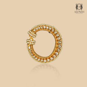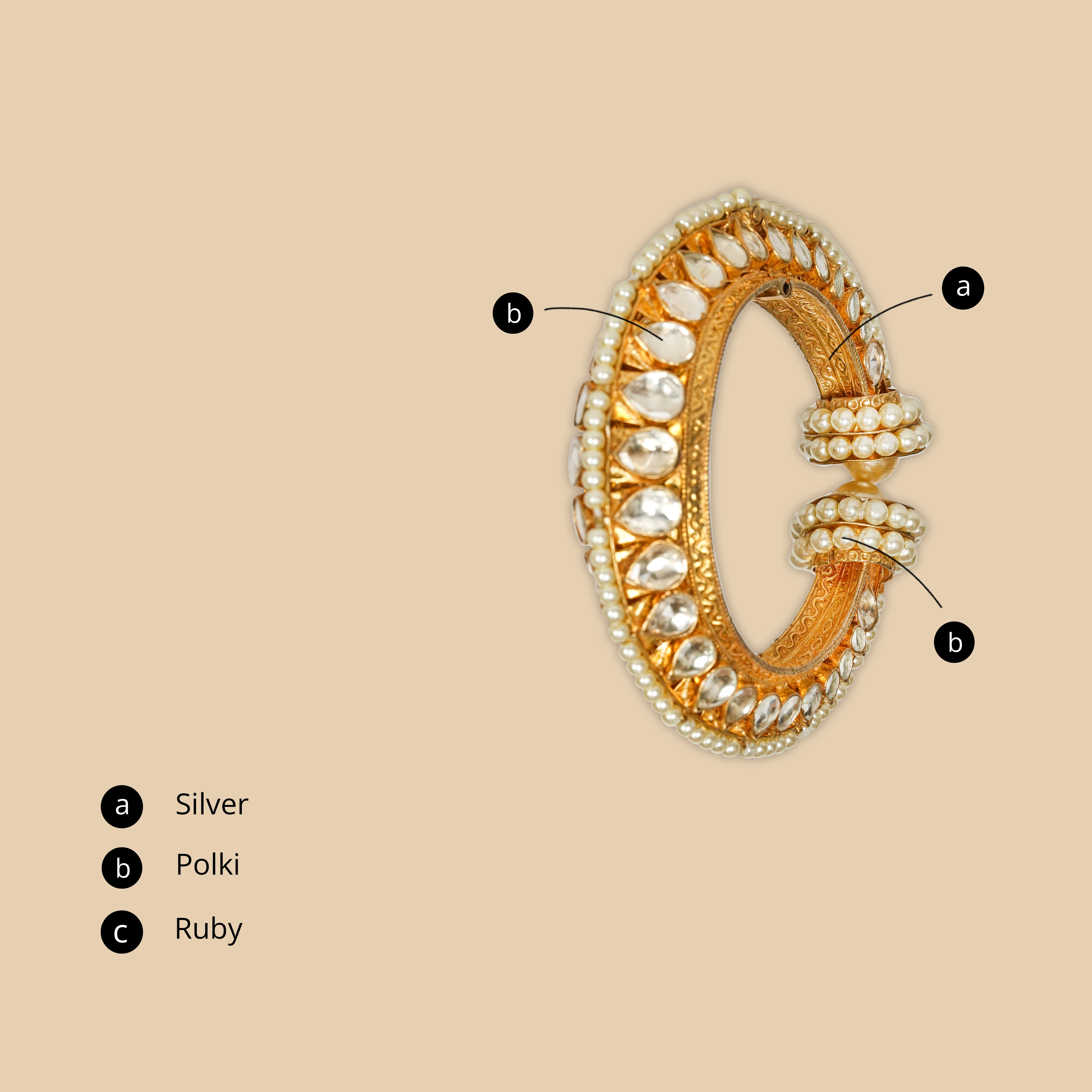 An Indian wedding bangle highlighting the timeless relationship of diamonds and pearls. Handcrafted in gold, this Indian wedding bangle is dressed in a carpet of pearls all over with an intricate pattern Handcrafted in gold, the Maya Bracelet is an elegant accessory that celebrates the timeless beauty of diamonds and pearls. Each bangle is adorned with a luxurious carpet of pearls, making it the perfect addition to any Indian wedding ensemble. Expertly crafted, this bangle is a testament to the intricate and meticulous attention to detail that sets it apart from the rest. Experience the perfect blend of traditional and modern with the Maya Bracelet.