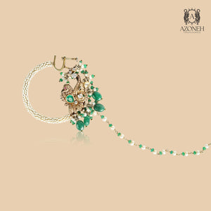 by intricate work and a slender chain that drapes the cheek with finesse.