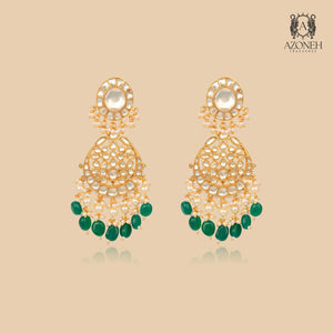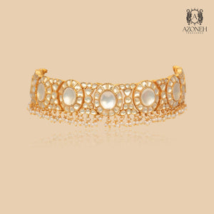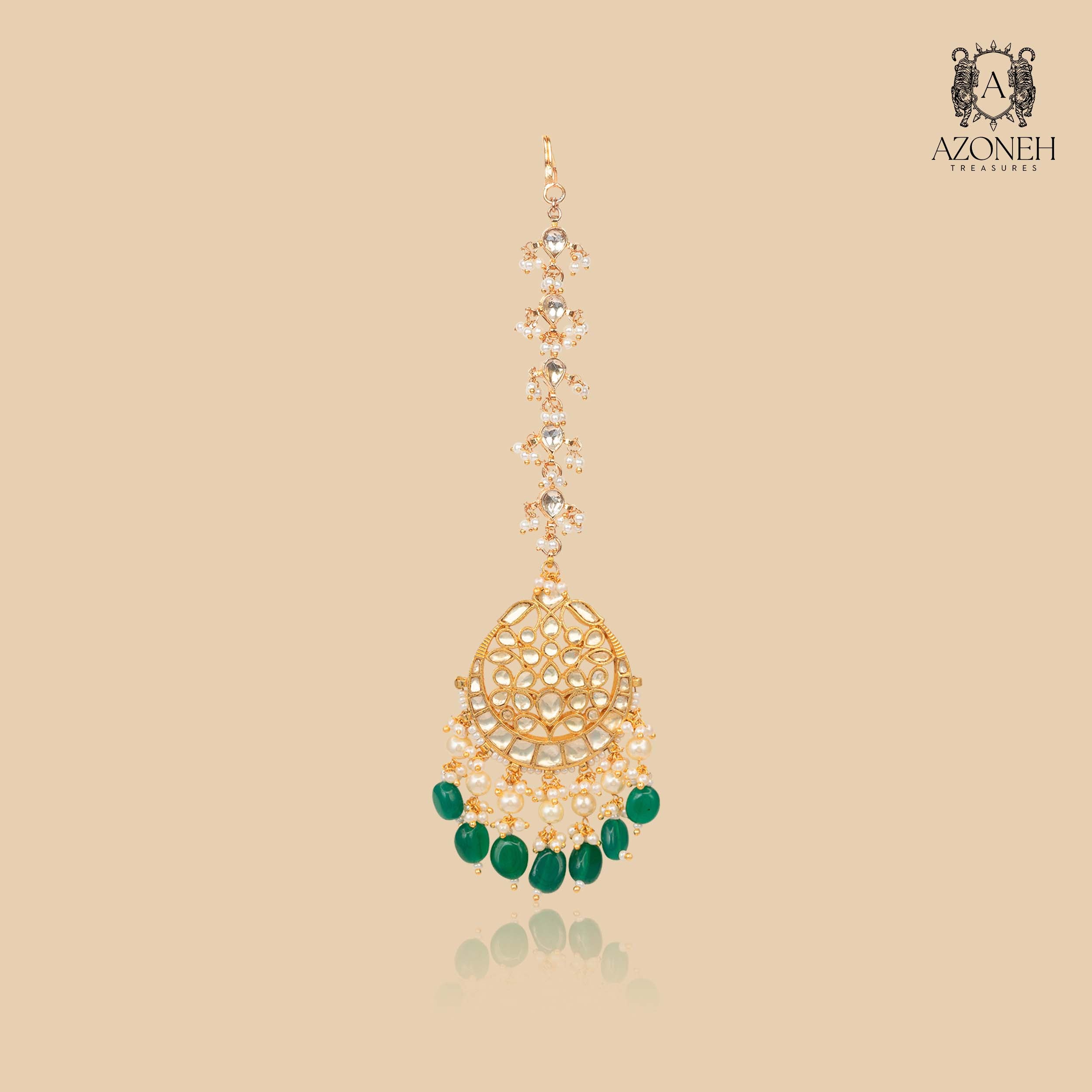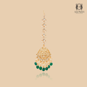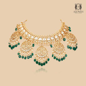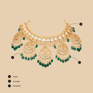 The Naveli Royal Accent Set is a graceful, heritage-inspired suite tailored for intimate celebrations or special occasions. It includes a choker, earrings, and pendant, highlighted by a subtle palette of pearls and emerald drops. Hand-embellished with gold filigree and delicate stones, each piece exudes sophistication and understated luxury. Designed for those who cherish classic Indian artistry with a contemporary touch, this set offers a lighter, more versatile alternative without sacrificing elegance. Whether worn solo or complemented by other jewelry, it envelops the wearer in radiant warmth, vintage charm, and timeless celebration.