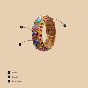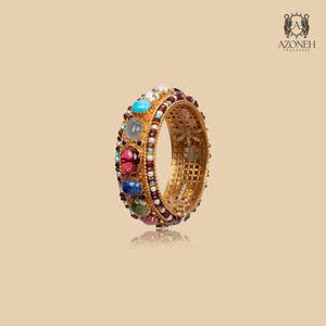 A celebration in every curve, the Navrangini Navratan Bangle doesn’t whisper—it sings. Its bold interplay of vibrant hues creates a symphony of colour, echoing the timeless artistry of Indian heritage. Each shade tells a story, weaving together joy, devotion, and festivity into a single masterpiece. The bangle wraps around the wrist like folklore in motion—radiant, dramatic, and unafraid to shine. More than adornment, Navrangini is a statement of spirit, for the woman who wears colour as her power and tradition as her crown.
