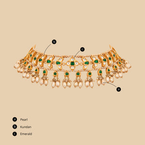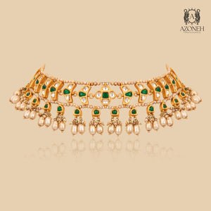 The Niharika Heritage Necklace dazzles with its exquisite lattice of gold and green. Glimmering green stones are set in intricate gold frames, forming two graceful rows that encircle the neck with heirloom elegance. Each section is finished with lustrous clusters of pearl drops, evoking the romance of royal courts and traditional Indian festivities. Perfect for weddings, festive galas, or special occasions, this choker seamlessly blends antique artistry with modern sophistication. Lightweight yet rich in detail, the Niharika Heritage Necklace ensures you stand out—brimming with timeless heritage, vibrant color, and the charm of fine craftsmanship.