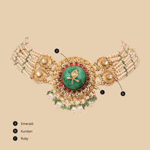 The Nizam’s Emerald Necklace blends lush emerald, ruby, and kundan