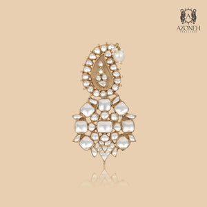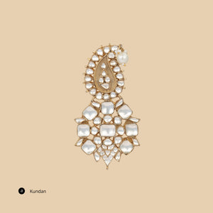 The Noor-e-Kundan Kalgi radiates with timeless brilliance, crafted entirely from sparkling kundan set in a traditional, teardrop-inspired silhouette. Multiple layers of intricately arranged gems reflect light elegantly, combining with vintage-style pearl fringes for the perfect blend of heritage and drama. This kalgi is the ultimate adornment for those who cherish detailed artistry and cultural richness, lighting up any occasion—especially weddings or high festivals—with charm, poise, and an unmistakable nod to royal traditions.