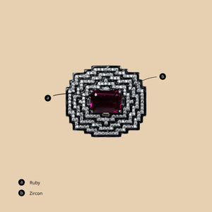 circles of ruby and zircon evoke a vintage evening skyline, powerful and poetic.
