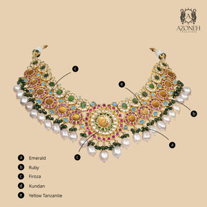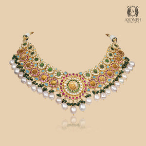 This necklace is pure celebration — like a royal mehfil captured in colour. The broad silhouette sits like a queen’s collar, drenched in heritage craftsmanship and festive grandeur. Ruby and emerald bring timeless royalty, while firoza adds a cool, breezy contrast that feels fresh and unique. Pearls soften the richness with their graceful sway, and yellow topaz adds a warm glow like candlelight on silk. This is not subtle jewellery — it is statement tradition, meant for brides who want drama, colour, and unforgettable presence. Wear it with plain outfits and let it do all the talking. Rang Mahal Gulband