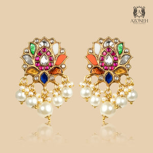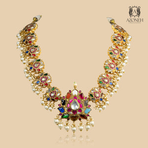 A riot of colour, but in the most royal way — this necklace is like wearing a celebration. Every shade feels intentional: fiery warmth, cool elegance, festive glow, and sacred richness — all tied together through heritage craft and grand detailing. Kundan work brings antique glamour, pearls soften the drama with grace, and the multicolour stones create a vibrant, queen-like aura that no minimal piece can compete with. This is not subtle — it is legendary. Made for brides who don’t want quiet luxury, they want loud heritage. Best paired with plain outfits so the necklace becomes the entire story. Rangrez Mahal Set