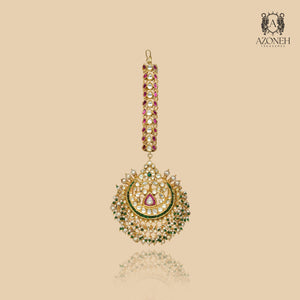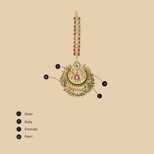 The dazzling array of polki/uncut diamonds, emeralds, and other colored stones is brought to life with a mix of time-honored techniques on a canvas of silver in the exquisite Rivan Tikka. This piece of fine jewelry is an undeniable merge of traditional Indian design and contemporary aesthetics.