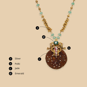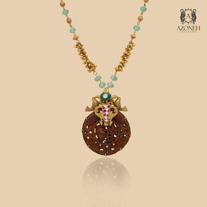 Vintage glitter with a modern twist, Riza is the kind of piece we'd go back to again and again despite the entirety of our jewel stash. Holding a wooden Mandala at its heart, the pendant is lined with emeralds. This pendant is a stunning combination of vintage glitter with a modern twist. With a wooden Mandala at its center and a lining of beautiful emeralds, Riza is a timeless piece that will elevate any outfit. Add it to your jewel collection for a touch of elegance and sophistication.