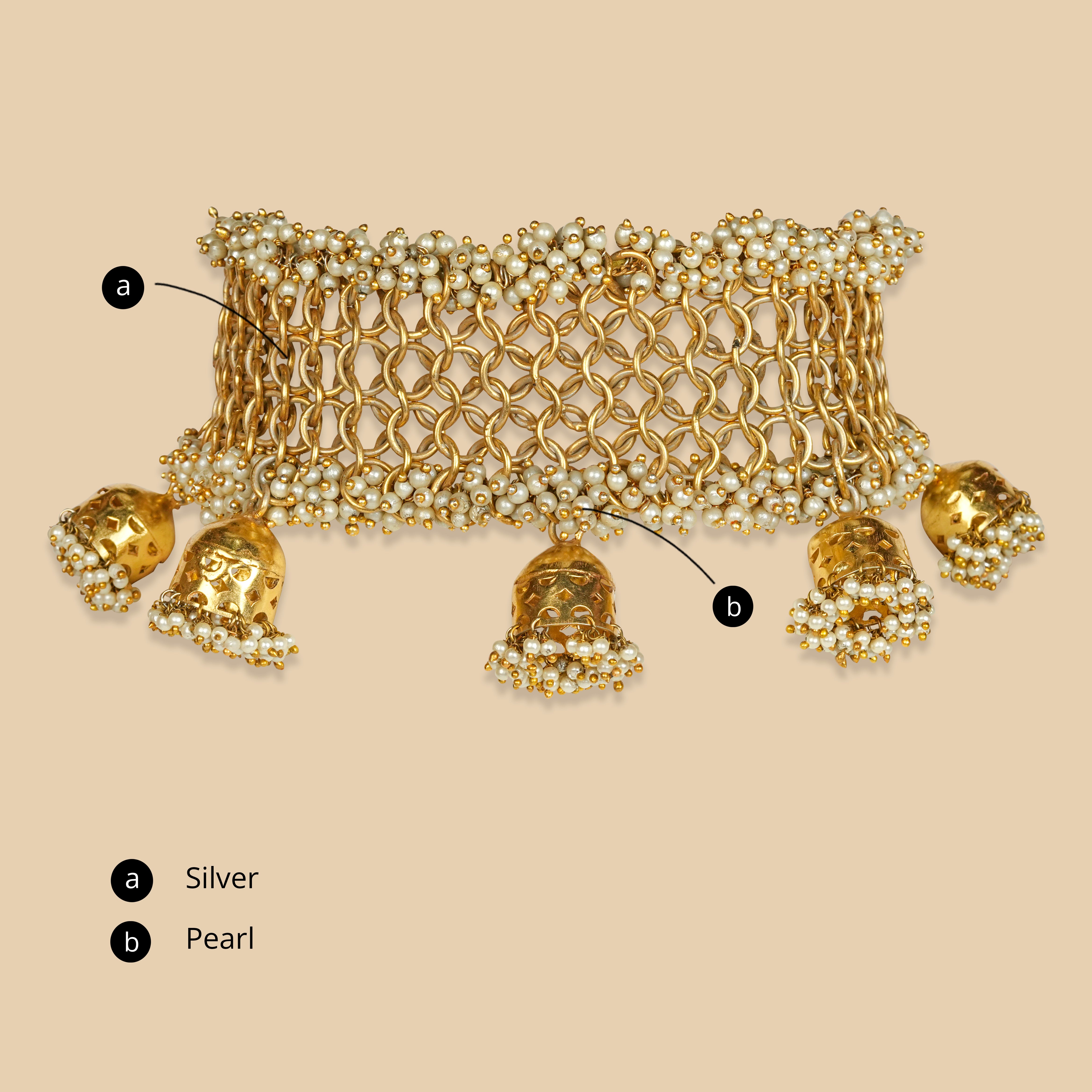 An Indian choker necklace delicately strung on lines of pearls handcrafted in silver. with delicate ghungroos attached to it, making it sweetly chime with every move you make. The necklace is crafted with the utmost care and thoughtfulness, using traditional Indian techniques and high-quality materials. The addition of delicate ghungroos creates a beautiful, harmonious sound with every step, elevating its elegance and charm.