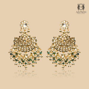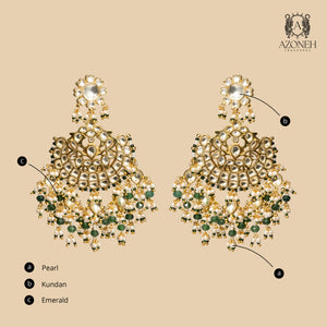 These chandbalis feel like the first note of a shehnai — grand, emotional, and unforgettable. The kundan work glows with old-world richness, like a piece saved in a royal trousseau for generations. Emerald accents bring depth and freshness, evoking palace gardens and sacred celebration. Pearl droplets finish the piece with softness, like blessings falling gently with every step you take. This pair frames the face in pure bridal elegance, making even the simplest outfit look ceremonial. Best worn on wedding nights, receptions, or those moments where you want to embody legacy, power, and grace. Sabz Shehnai Chandbalis