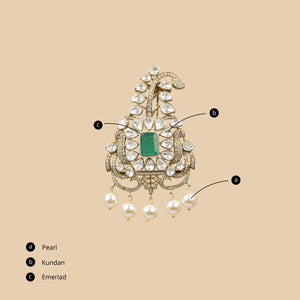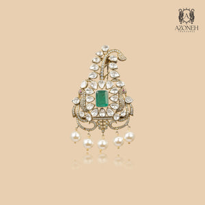 The Shahi Zamrud Kalgi is a testament to royal splendor, featuring a vibrant emerald centerpiece framed by intricate kundan work and luminous pearls. Delicate pearl drops sway with each movement, catching the light and granting the wearer an aura of regal celebration. Every detail, from the finely set stones to the elegant silhouette, is designed to crown the turban with legacy and grace. Choose this kalgi to transform a groom’s ensemble or elevate any ceremonial look, blending old-world artistry with modern prestige for a majestic finishing touch.