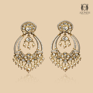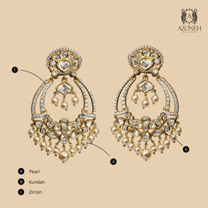 Inspired by old palace arches and sacred doorways, these earrings feel like a blessing framed in gold. The kundan detailing gives classic heritage drama, while zircon brilliance adds that crisp, camera-flash sparkle — clean, refined, and luxurious. Pearls hang below like soft prayers, swaying with every step and turning movement into poetry. The silhouette feels timeless: not too heavy, not too minimal — just the perfect in-between that makes you look instantly elevated. Wear it with an ivory saree, a deep neckline, or bridal glow that needs no effort. Sitara Mehrab Drops