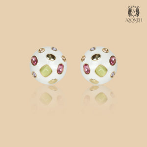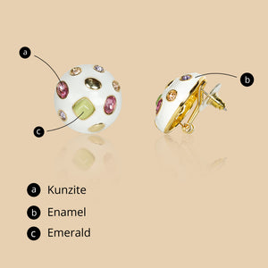 A striking pair of minimal studs, these earrings look playful yet sophisticated. Worked in enamel, a bed of varying cuts and colors of tooti-frooti gemstones gives this design a distinctive look. These earrings are designed to make a statement while maintaining a sleek and refined appearance. Made with high-quality enamel and adorned with a variety of tooti-frooti gemstones in different shapes and shades, they possess a unique and eye-catching aesthetic.