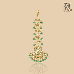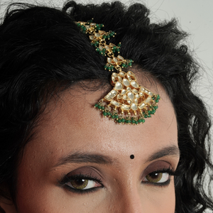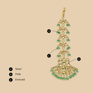Crafted in gold our Vasudha maangtika features a chaand accentuated with floral motifs in green hues and uncut diamond/polki finished with emerald drops and pearl details. With its intricate design and luxurious materials, our Vasudha maangtika is perfect for those looking to add a touch of elegance to any outfit. Crafted in high-quality gold, this maangtika boasts a beautiful chaand accent adorned with floral motifs in stunning green hues. Its uncut diamond/polki finish and exquisite emerald drops and pearl details make it a true standout piece that will elevate your style game.